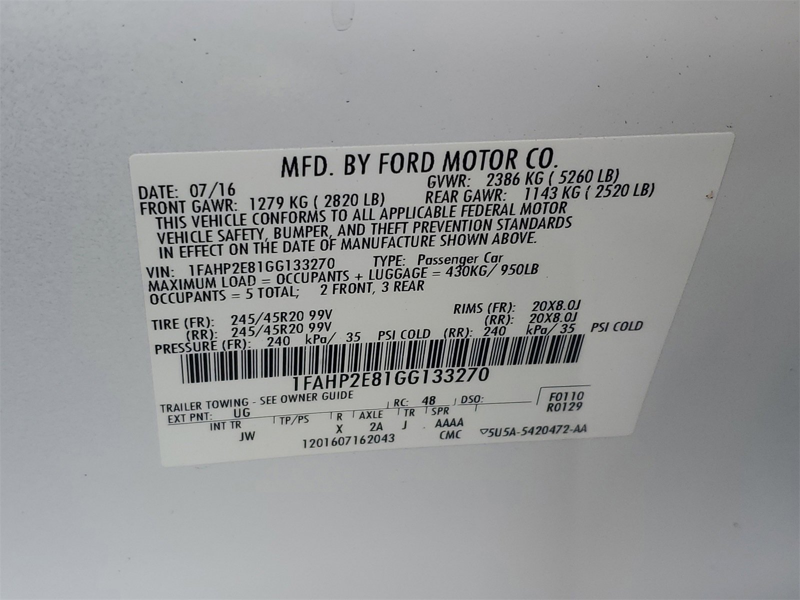 BLUE CERTIFIED, Ford Blue Advantage: Blue Certified Certified, 18 Painted Aluminum Wheels, 4-Wheel Disc Brakes, 6 Speakers, ABS brakes, Additional IP Center Channel Speaker, Air Conditioning, Alloy wheels, AM/FM radio: SiriusXM, AM/FM Stereo/Single CD/MP3 Capable, Auto-dimming Rear-View mirror, Automatic temperature control, Brake assist, Bumpers: body-color, CD player, Compass, Delay-off headlights, Driver door bin, Driver vanity mirror, Dual front impact airbags, Dual front side impact airbags, Electronic Stability Control, Emergency communication system: 911 Assist, Equipment Group 201A, Exterior Parking Camera Rear, Four wheel independent suspension, Front anti-roll bar, Front Bucket Seats, Front Center Armrest, Front dual zone A/C, Front reading lights, Fully automatic headlights, Heated door mirrors, Illuminated entry, Intelligent Access w/Push Button Start, Low tire pressure warning, Non-Memory Power Adjustable Pedals, Occupant sensing airbag, Outside temperature display, Overhead airbag, Overhead console, Panic alarm, Passenger door bin, Passenger vanity mirror, Power door mirrors, Power driver seat, Power Moonroof, Power passenger seat, Power steering, Power windows, Radio data system, Rear anti-roll bar, Rear Parking Sensors, Rear reading lights, Rear seat center armrest, Rear Spoiler, Rear window defroster, Remote keyless entry, Security system, Speed control, Speed-sensing steering, Speed-Sensitive Wipers, Split folding rear seat, Steering wheel mounted audio controls, SYNC 3, SYNC w/MyFord, Tachometer, Telescoping steering wheel, Tilt steering wheel, Traction control, Trip computer, Unique Cloth Bucket Seats, Variably intermittent wipers, Wheels: 20 Machined Finish.