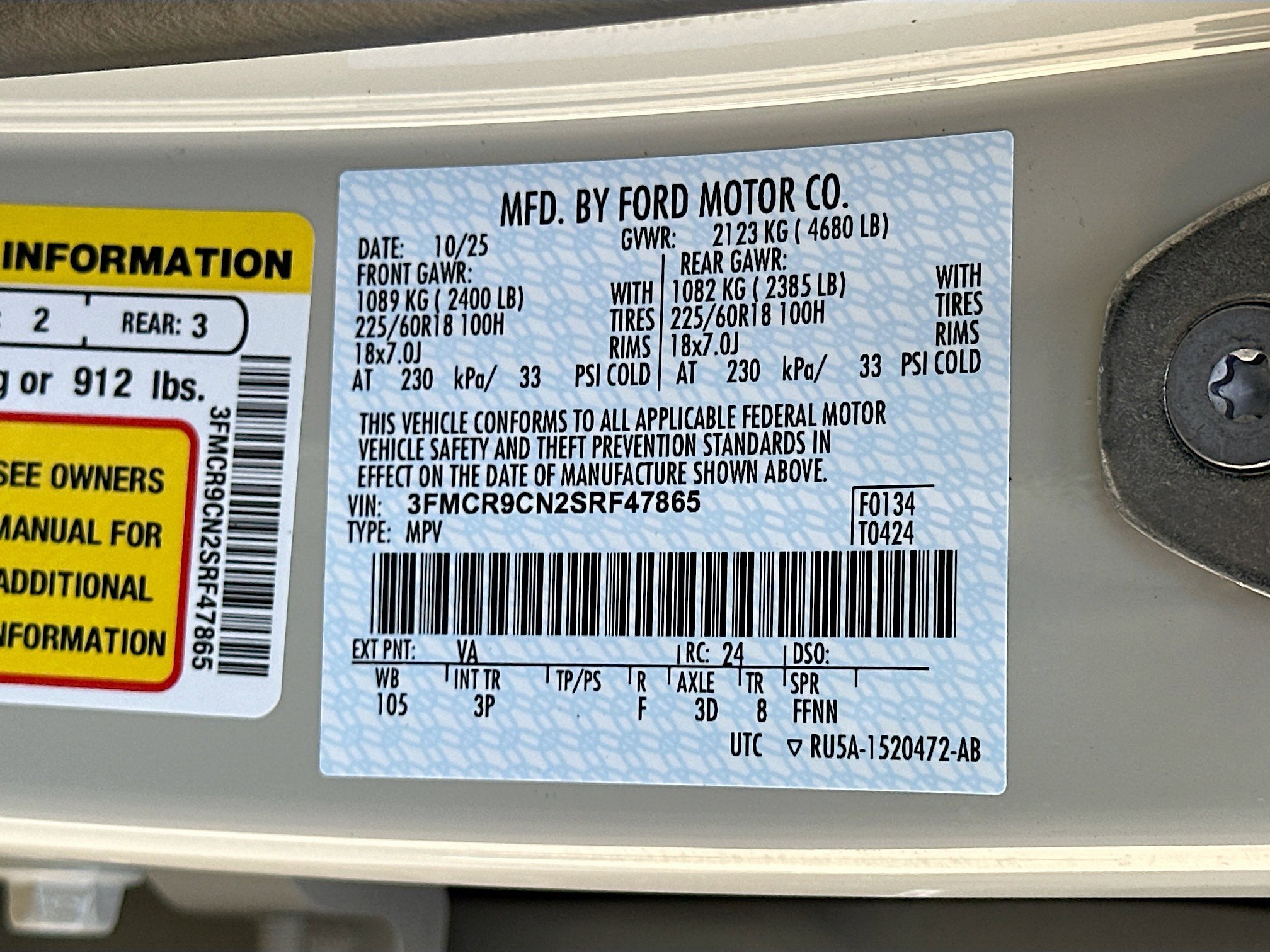 • VIN # 3FMCR9CN2SRF47865
