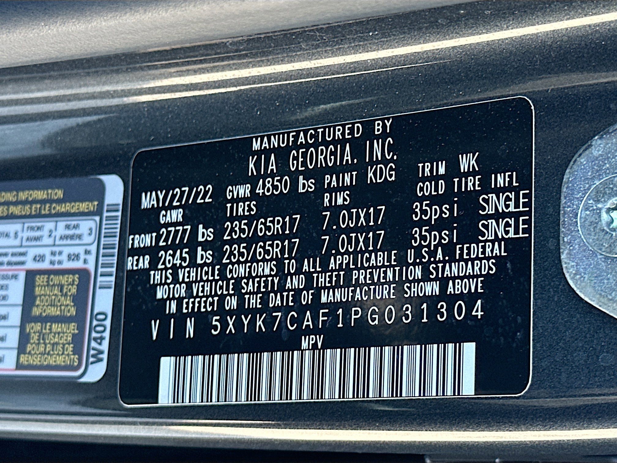 • VIN # 5XYK7CAF1PG031304