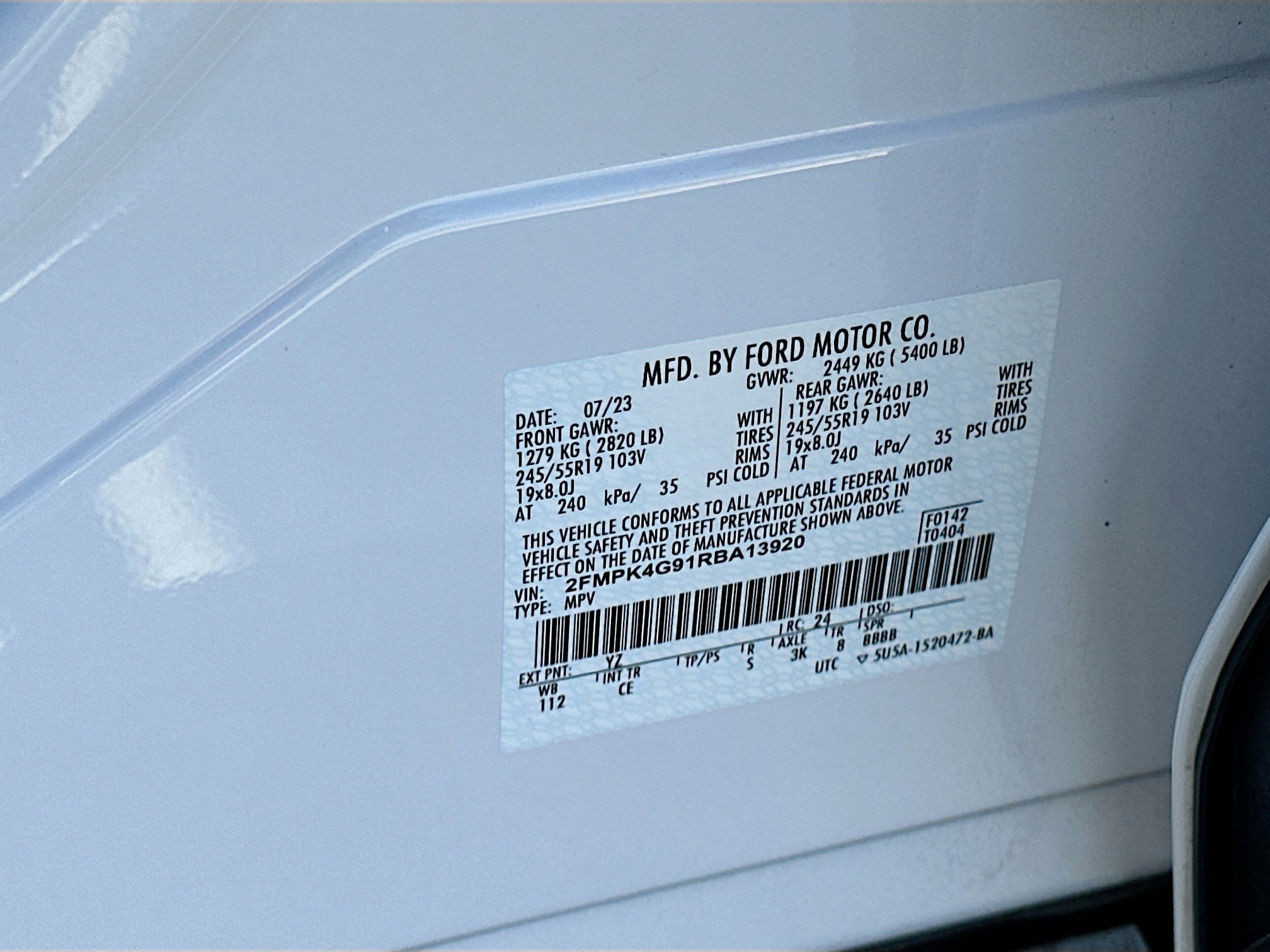 • VIN # 2FMPK4G91RBA13920